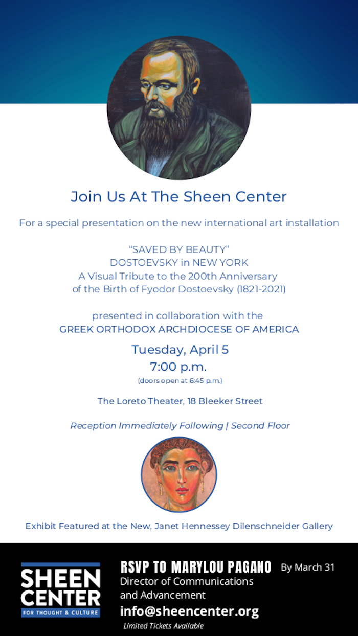 Fyodor Mikhailovich Dostoevsky (1821-1881) is among the greatest literary geniuses of all time, having written such masterpieces as, The Brothers Karamazov and Crime & Punishment, that plumb the depths of the human soul and wrestle with eternal questions of the spirit. Having toured Greece and making its New York premiere at The Sheen Center, this exhibit spans two floors and gives visual expression to characters and existential and moral themes from his novels through a variety of painting styles by seven artists.