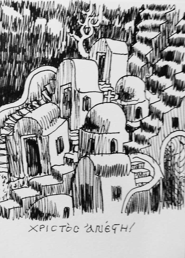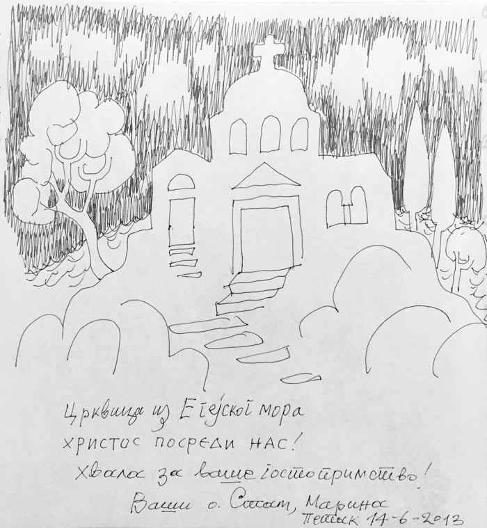 On Saturday 10the of May, 2014, in the theater “TRIANON” in Athens a movie with titled “THE ICONOGRAPHY IN LIGHT OF HOLINESS" was projected; with Stella Arkenti, as producer and Sotiria Adam as music director, showing the ARTISTIC WORK of Fr Stamatis Skliris. The speakers were: Fr. Petros Minopetros, film director, Haris Kambouridis, art critic, and Demetrios Kyriazis, psychiatrist. At the end of the event, Fr Stamaris Skliris signed the DVD of the movie on the spot, and drawn on each of them a sketch, a total of 60 drawings. Some of them are displayed here.