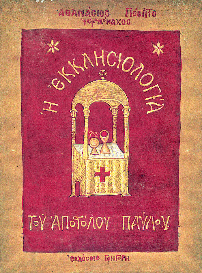 Bookcover for "Ἡ Ἐκκλησιολογία τοῦ Ἀποστόλου Παύλου κατὰ τὸν ἱερὸν Χρυσόστομο" by Hieromonk Athanasios Yevtich, acrylic on cardborad, 1984.