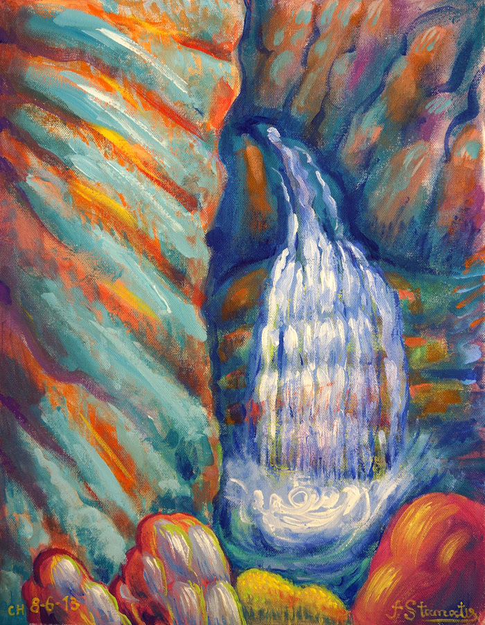 In this painting, which is the first in the series, I painted a small waterfall in the canyon, and I left room to write the name of the location later, because I don’t know the exact name right now. Half of the canvas displays a large rock, which goes from the top to the bottom. On the right is the source from which the water comes.