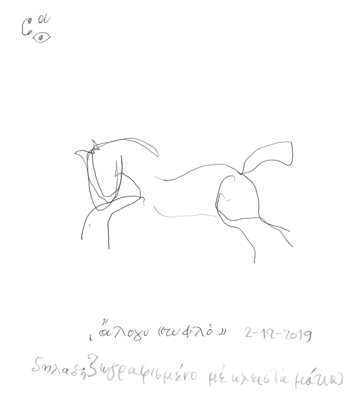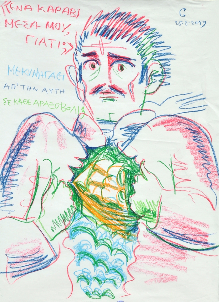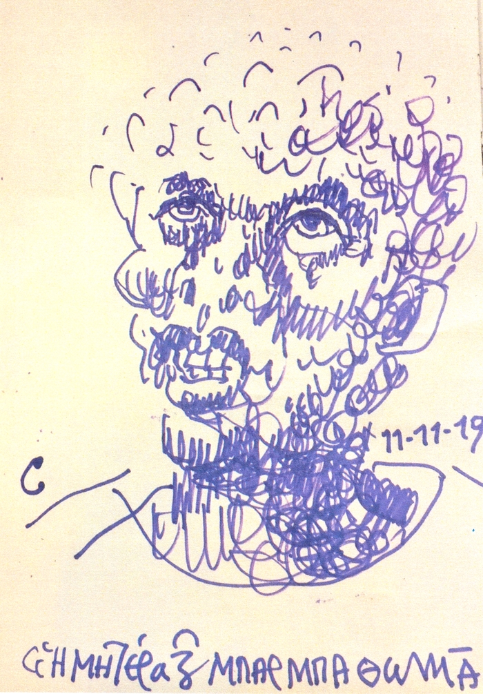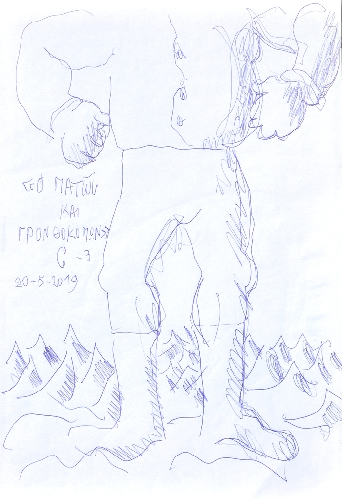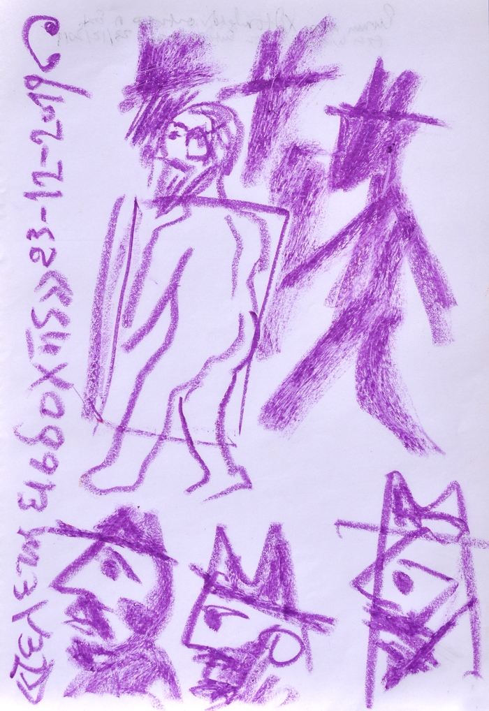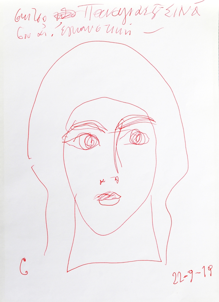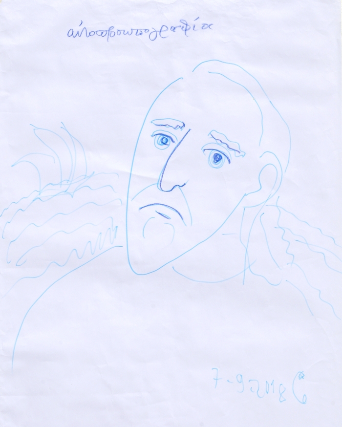 Π-20-ΑΓΓΕΛΟΣ μας χαιρετά, 2020, μπλε ακρυλικό σε λευκό μουσαμά, 69Χ56 εκ.