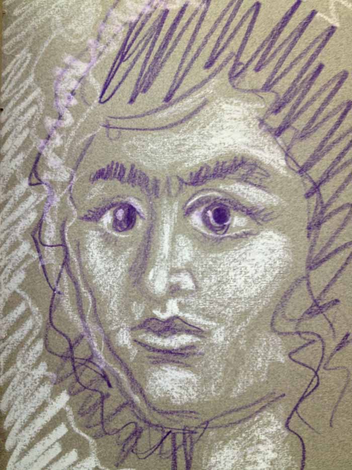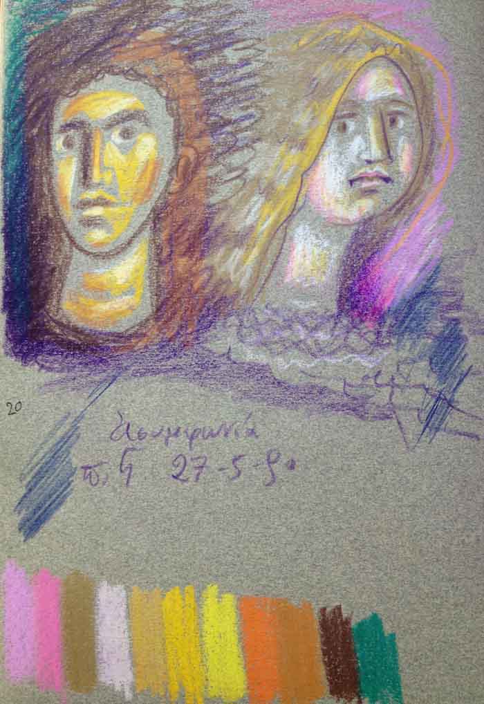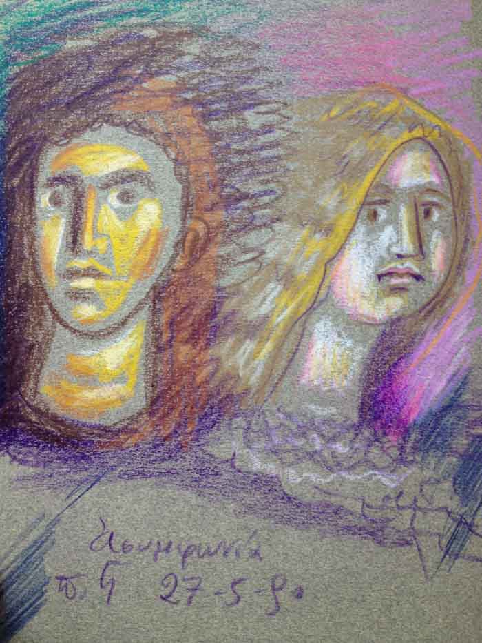 "THE TEENAGERS OF ATHENS" started with the two little purple faces that my son Dionysios drew around 1989 as a third-grade student, and I continued playing with the crayons (without intending to make it a complete work) after many years and once (2014?) I added the Parthenon and the mountains of Athens (Parnitha) to make it more comprehensive.