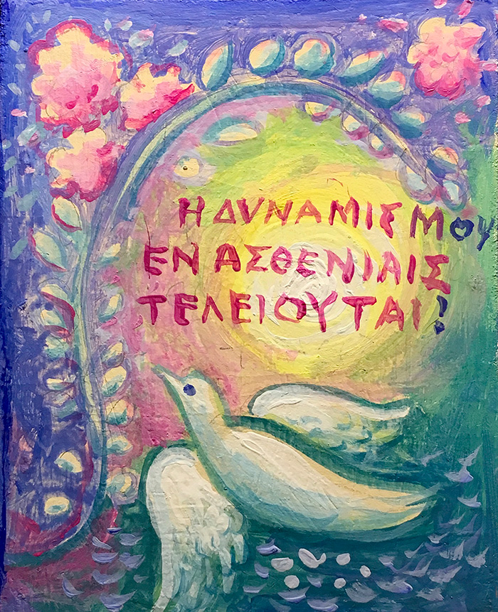 "Η ΔΥΝΑΜΙΣ ΜΟΥ ΕΝ ΑΣΘΕΝΕΙΑΙΣ ΤΕΛΕΙΟΥΤΑΙ", μικρός πίνακας κουτάκι για τον Μιχαήλ και την Ιωάννα.