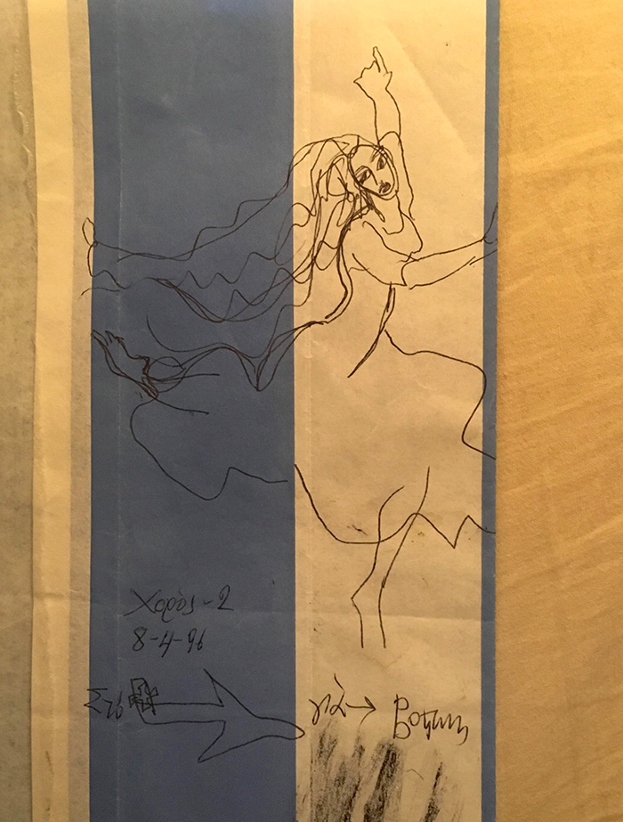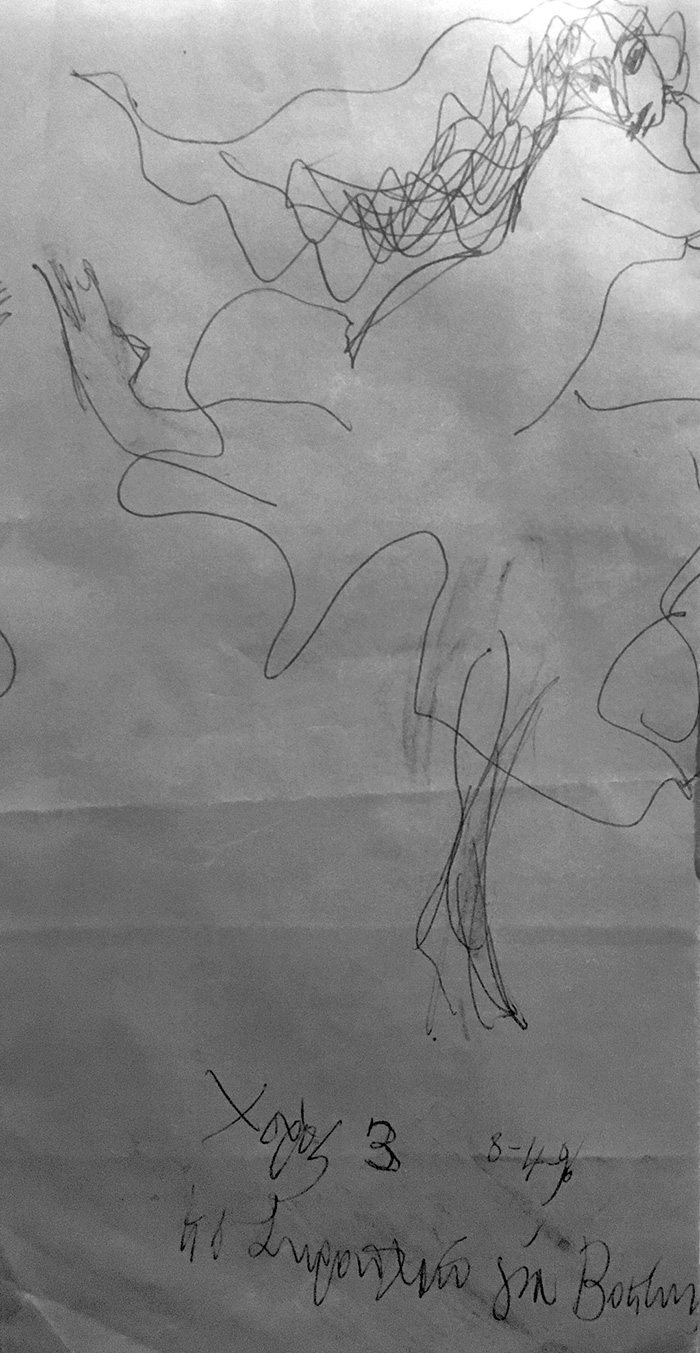Ο Γιώργος κι η Μαρινα κατέγραφαν τα φάρμακα που θα έπρεπε να περάσουμε σε ειδικό κατάλογο όταν θα φθάναμε στο αεροδρόμιο της Βοστώνης. Εγώ κράταγα παρέα στον νεαρό Διονύση, μαθητή Β´ Λυκείου, για να μην ακούει για φάρμακα και γιατρούς και τρομάζει . Καθώς του έλεγα και μου έλεγε αστεία, πήρα από την τσέπη του καθίσματος τον χάρτινο φακελο για περίπτωση εμέτου και σρχισα με το στύλο να ζωγραφίζω παραλλαγές στο θέμα «Χορός 1, 2, 3». Ξέχναγα κι εγώ κι ο Διονύσης τον πόνο μας. Κι είχα την ιδέα να τα ζωγραφίσω με χρώματα όταν γυρίσουμε Αθήνα .Δοξς τω Θεώ όλα πήγαν καλά και γυρίσαμε , αλλά δεν βρήκα χρόνο να βάλω χρώματα στα ζΣχεδια εκείνα του Πόνου.