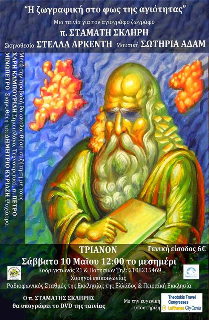 Η ταινία της Στέλλας Αρκέντη και της Σωτηρίας Αδάμ για τον ζωγράφο και αγιογράφο παπα Σταμάτη Σκλήρη με τίτλο "Η ζωγραφική στο φως της αγιότητας" ξαναπροβάλλεται μετά από απαίτηση του κοινού. Το Σάββατο 10 ΜΑΪΟΥ ώρα 12:00 το μεσημέρι, για μια προβολή στον κινηματογράφο ΤΡΙΑΝΟΝ, Κοδριγκτώνος 21 (Πατησίων 101).