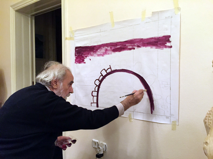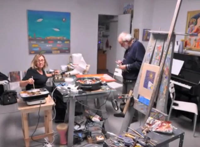 Father Stamatis Skliris with Euphrosyne Doxiadis painting with encaustic method in Babis Pilarinos atelier in Monday February 3, 2014.