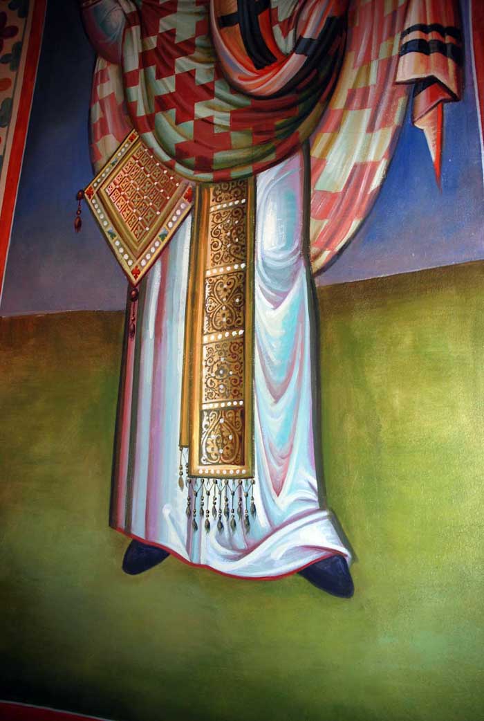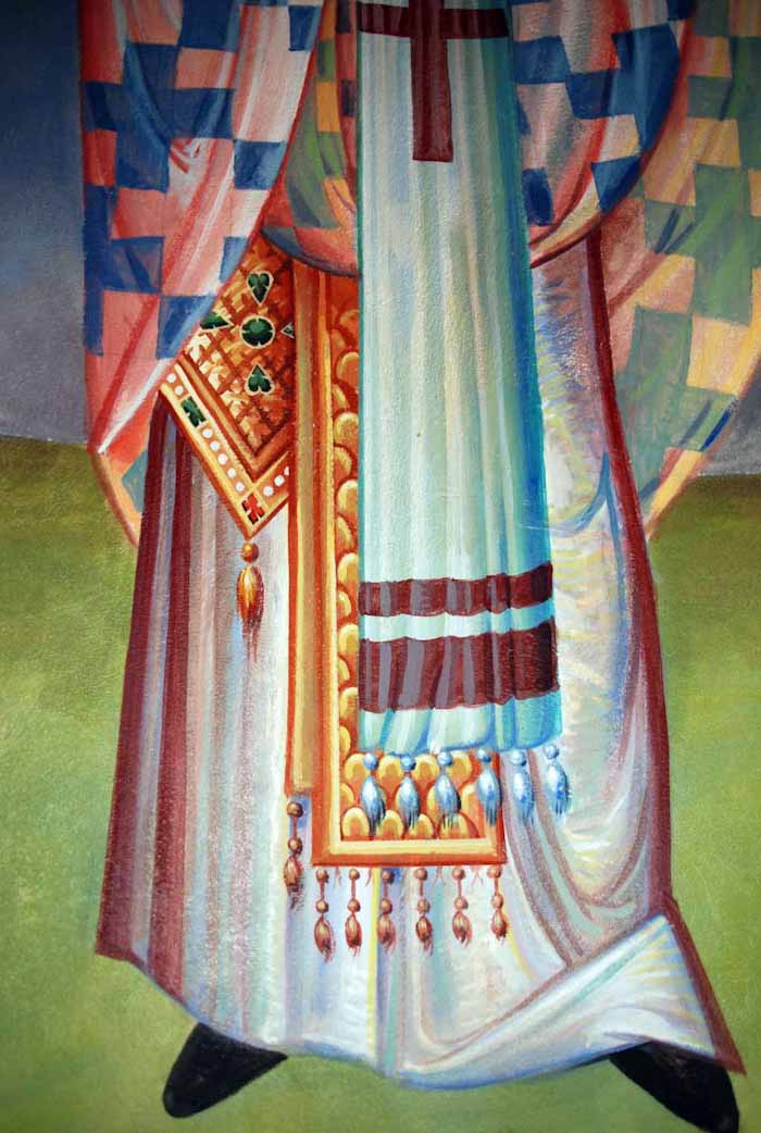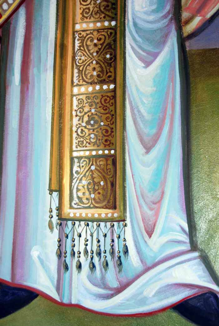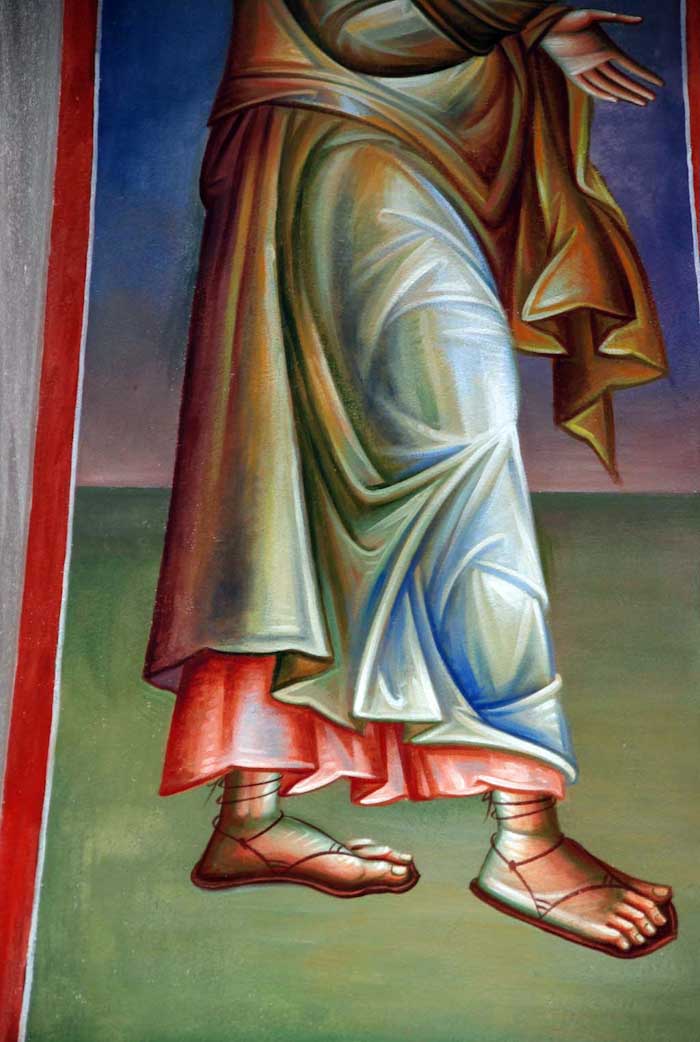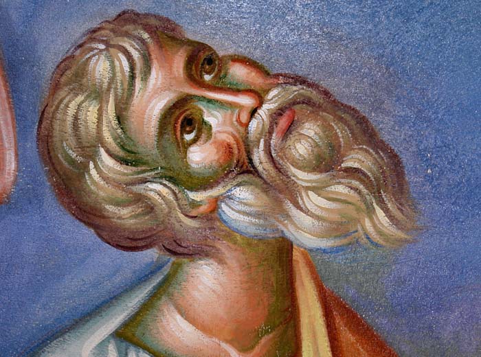 Fr Stamatis begins to paint St John the Theologian in St Nektarios, Ano Voula. Here are seen the first steps, a piece of Saint's garment.