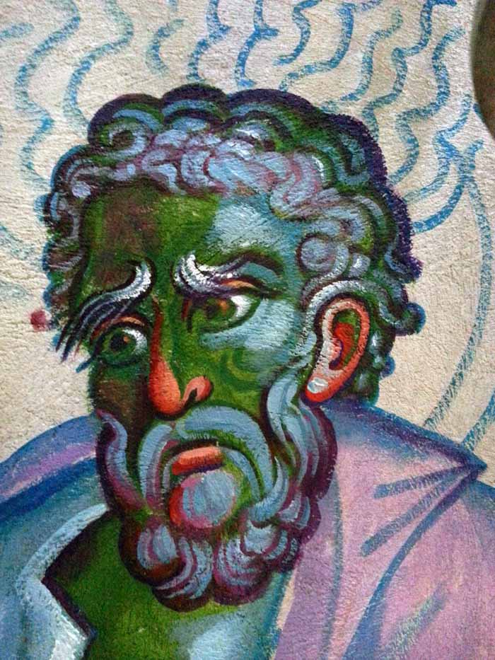 Unfinished face of St John the Theologian, who receives the divine inspiration to write the Gospel. The detail of wall-painting by Stamatis Skliris in St Nektarios Church, Ano Voula, Attiki. Friday, June 6, 2014