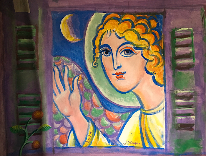 An Angel Greeting Us through the Window, acrylic on canvas, 50x70, Porto Rafti, Thursday, January 22, 2015. Eκεί εκεί στον κόλπο του Πόρτο Ράφτη, στην γαλάζια μωβ Πύλη που μας βγάζει στο Αρχιπέλαγος, εκεί που η φαντασία ζηλεύει την πραγματικότητα καθώς το υγρό κσι το στερεό στοιχέιο ονομάζονται ευτυχισμένη ακροθαλασσιά, εκεί πέρασα το απόγευμα των χρυσών αντανακλάσεων ζωγραφίζοντας τον άγγελο της νύχτας να μας χαιρετά γελαστός. Είναι τόσο κοντινός μας που έχει απεκδυθή τα χρυσά βυζαντινά του ρούχα και μας κοιτάει πολυ βαθειά μέσα στο τριαντάφυλλο της καρδιάς μας καθώς μας ακούει από το ψυχικό μας αμέτρητο βάθος και μας απλώνει το χέρι λέγοντας "γειά σας είμαι εδώ κοντά σε ετοιμότητα αγάπης. Αν με χρειασθείτε κάπου εδώ κοντά θα είμαι".
