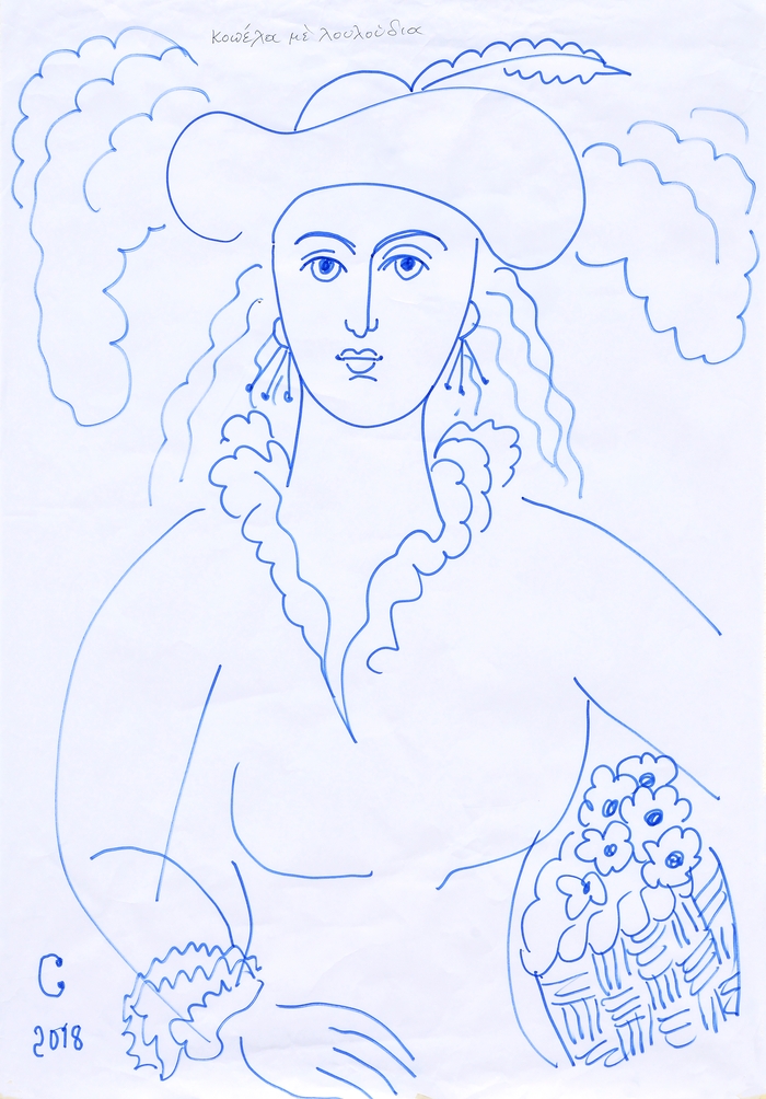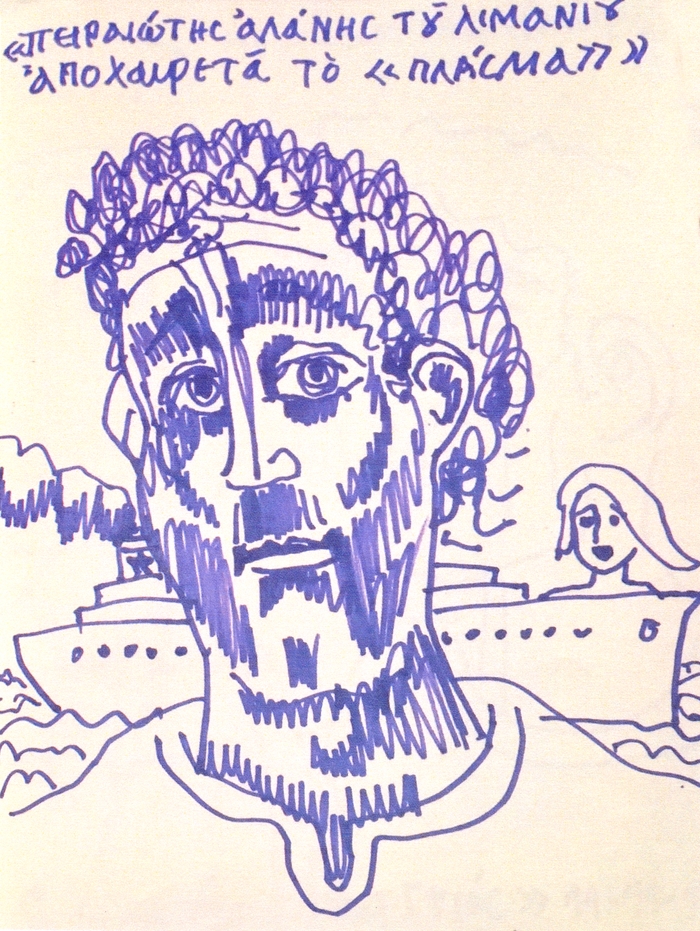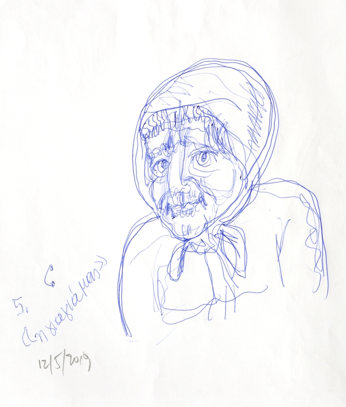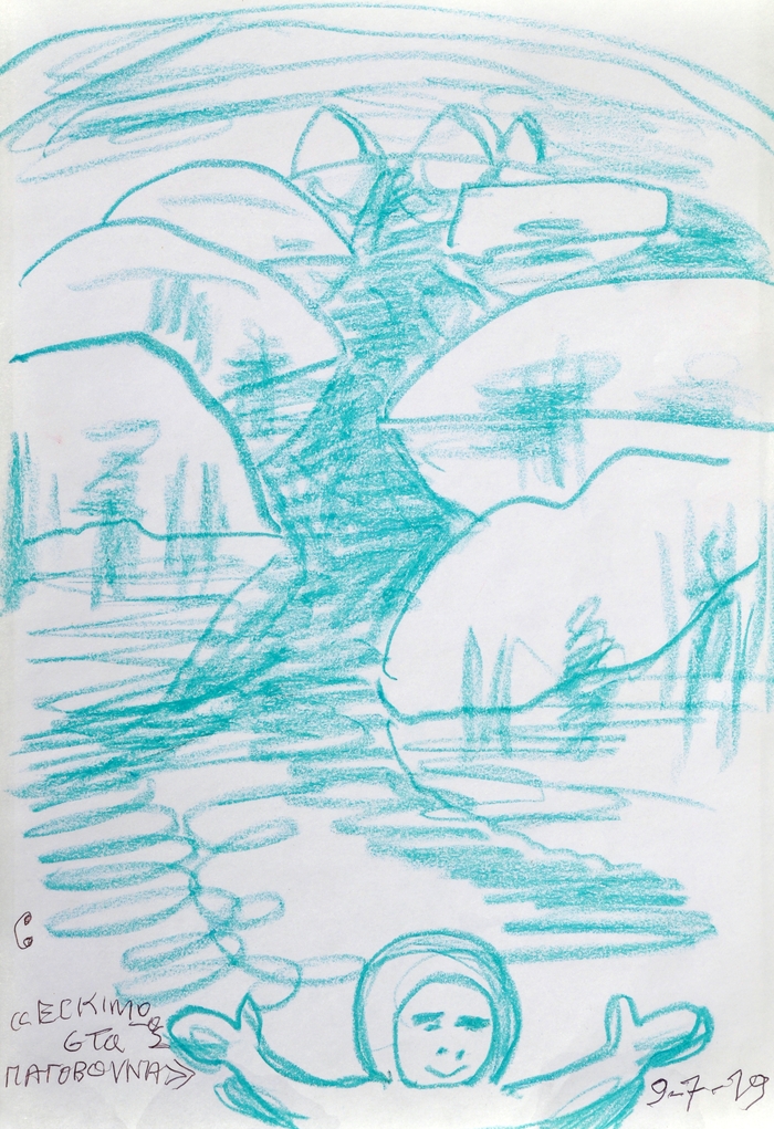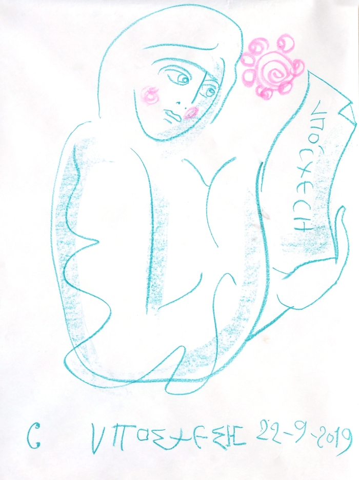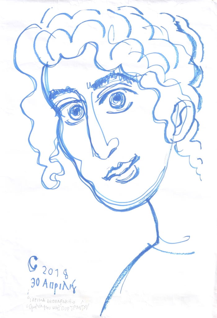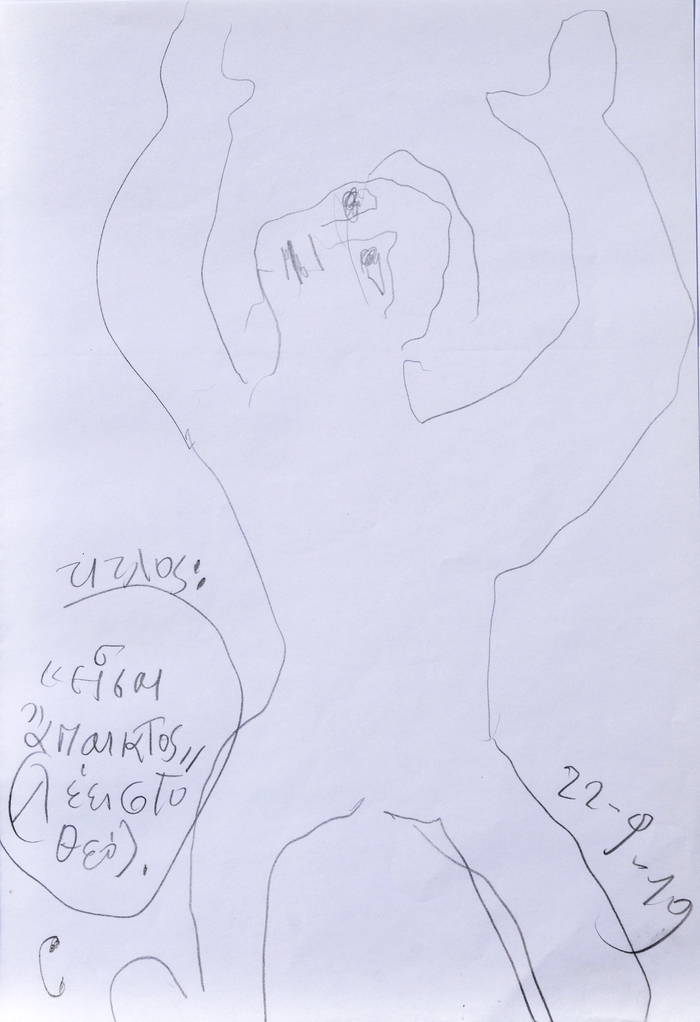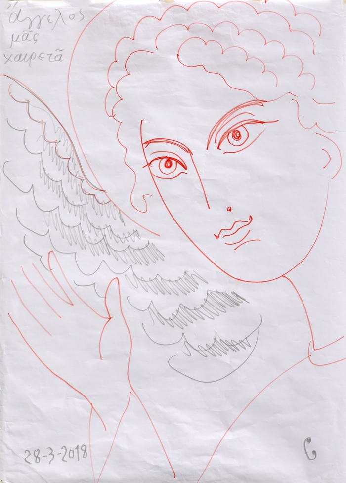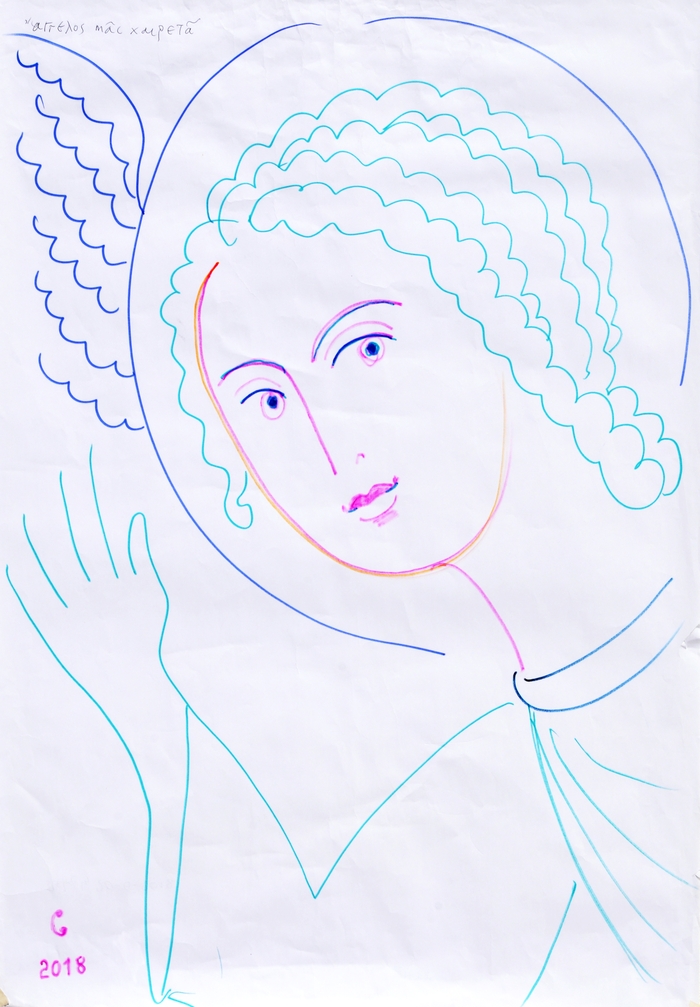 Π-20-ΑΓΓΕΛΟΣ μας χαιρετά, 2020, μπλε ακρυλικό σε λευκό μουσαμά, 69Χ56 εκ.