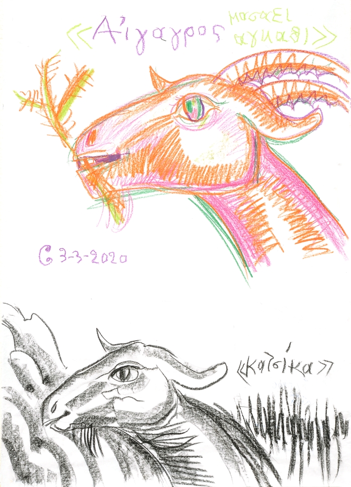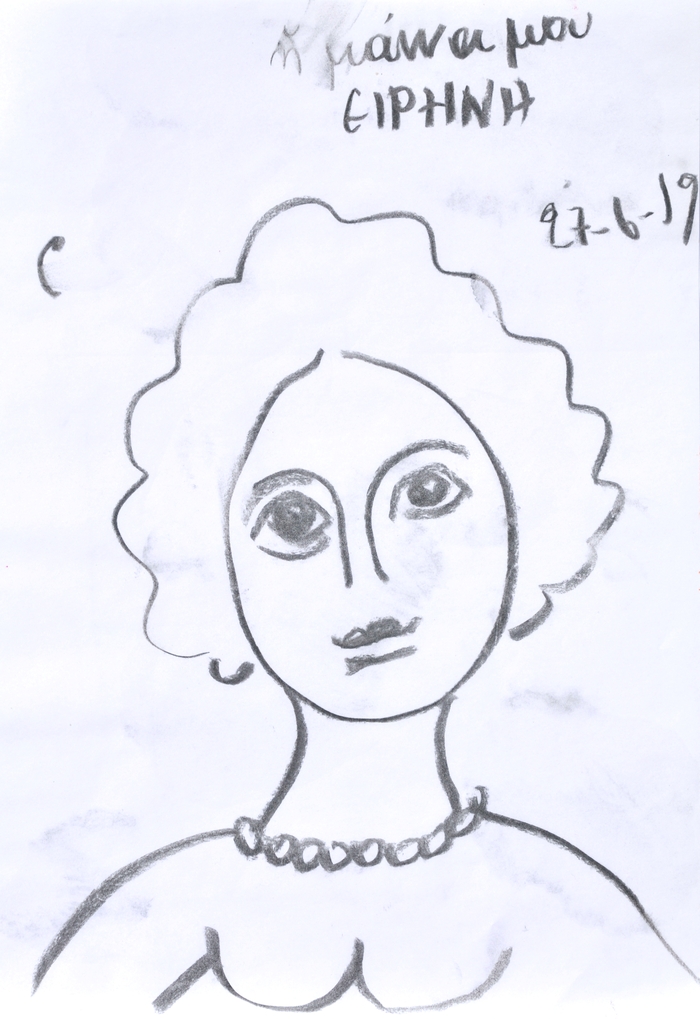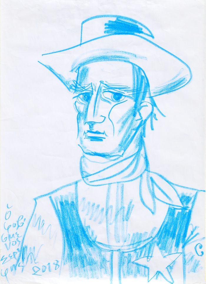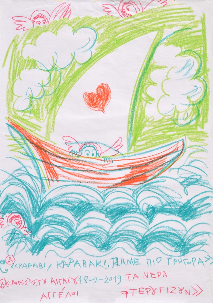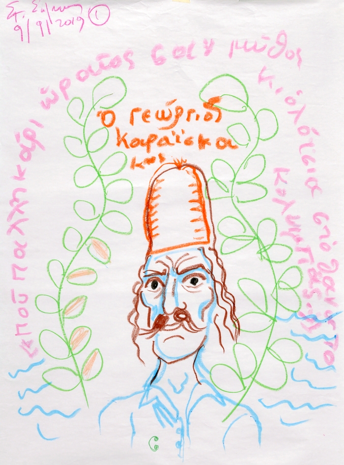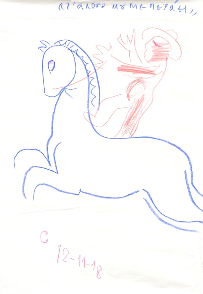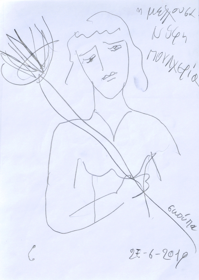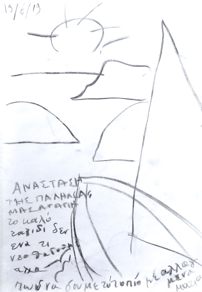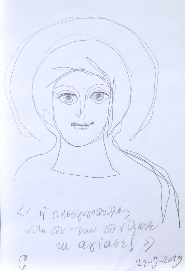 Π-20-ΑΓΓΕΛΟΣ μας χαιρετά, 2020, μπλε ακρυλικό σε λευκό μουσαμά, 69Χ56 εκ.