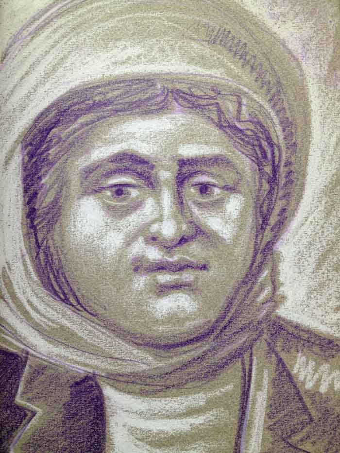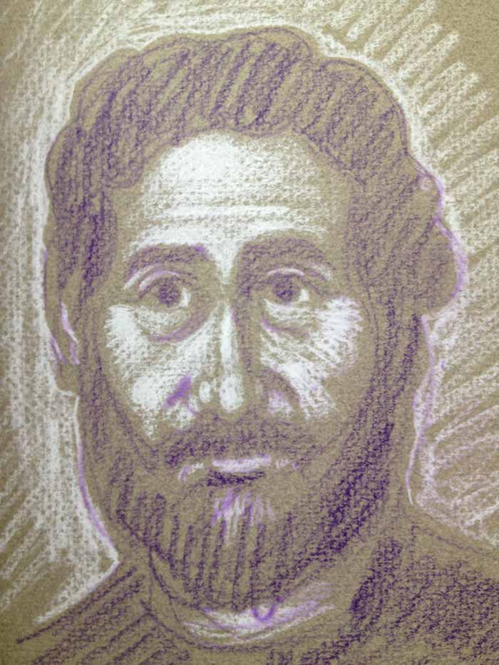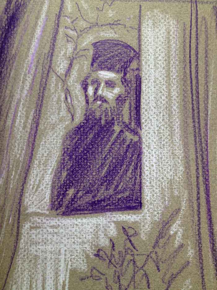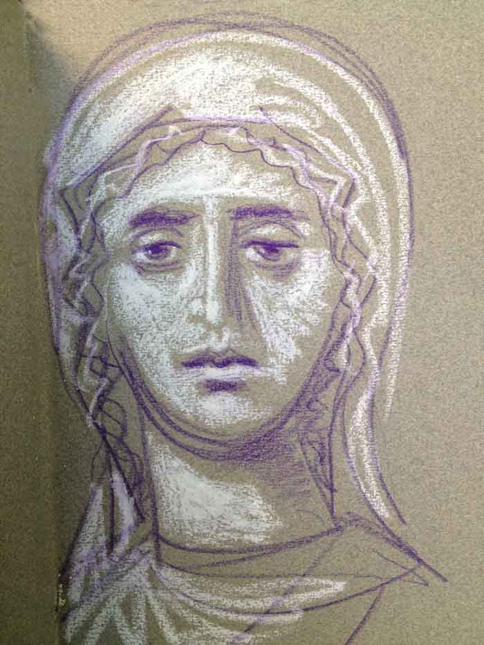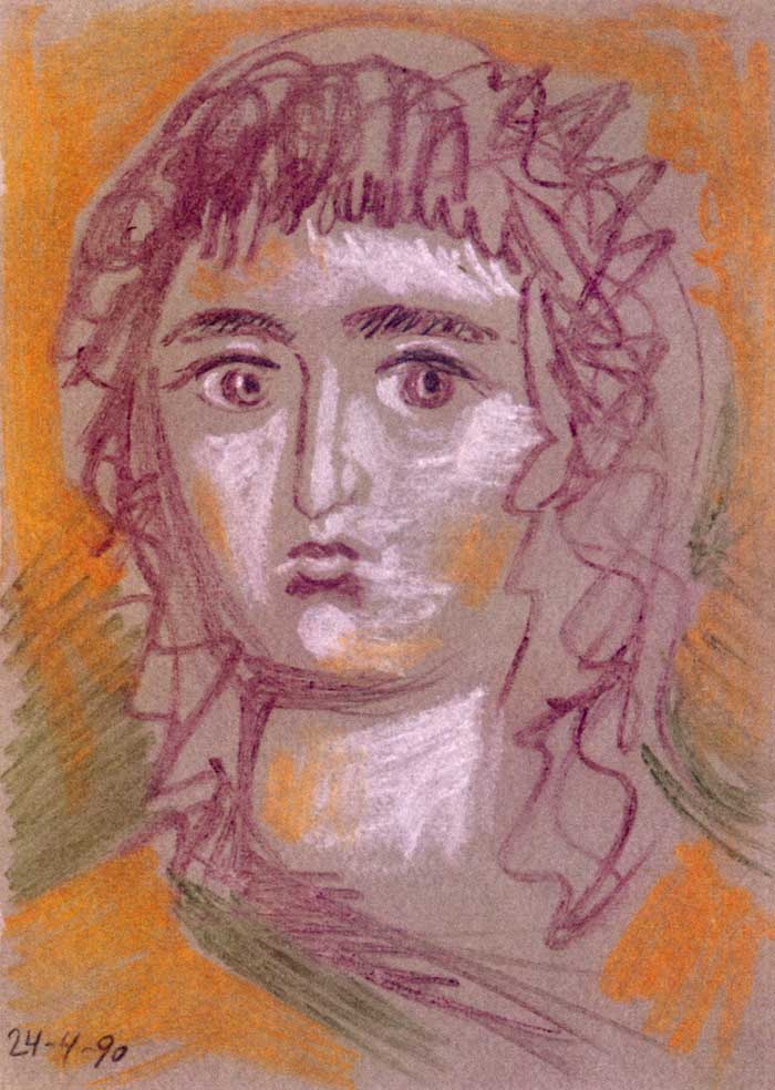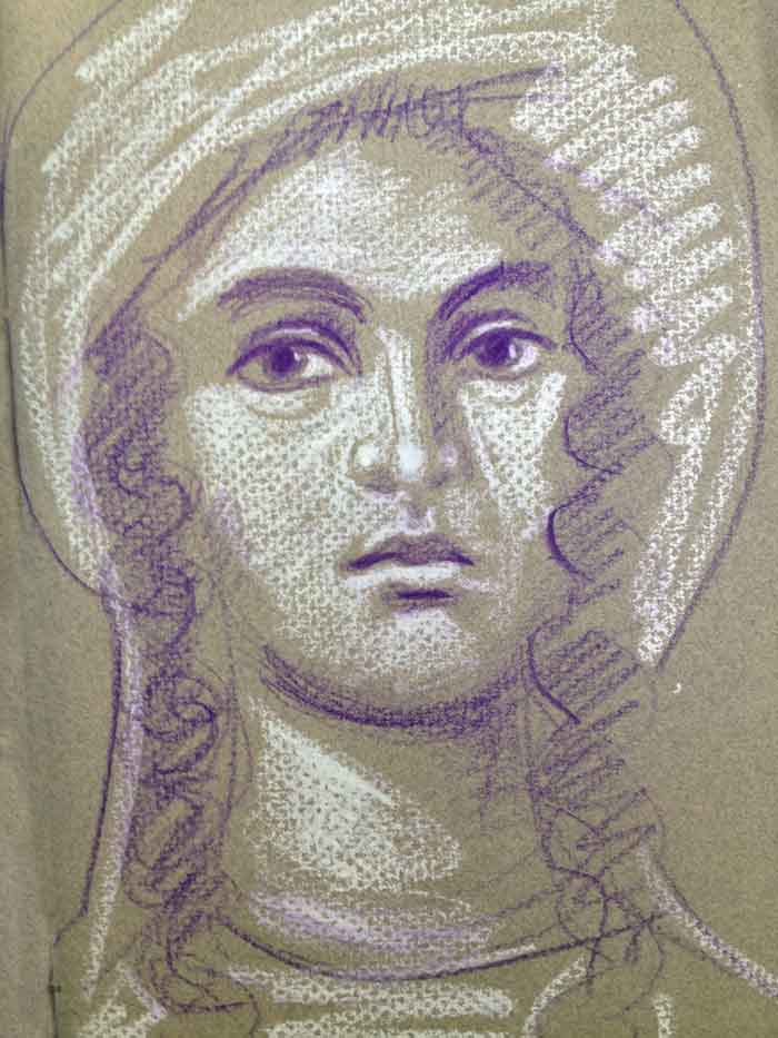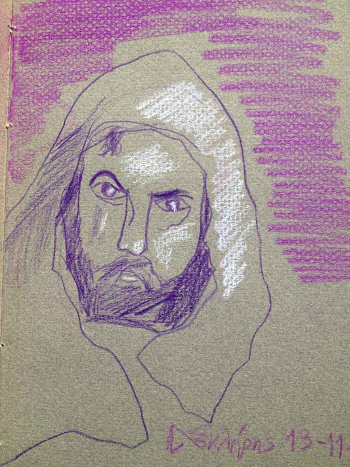 Stamatis’ pastels are a unique effort among the Orthodox iconographers to evoke and elicit the byzantine artistic view through the medium of pastel. The color effect of these pastels is very close to the natural dry pigments. Pastel is an art medium in the form of a stick, consisting of pure powdered pigment and a binder. These portrayals show that the byzantine art is not limited in its potential. Stamatis pastel crayons (from pure powdered pigments) vigorously capture various human psychological moments. The pastel medium was first mentioned by Leonardo da Vinci in 1495. During the 18th century the medium became fashionable for portrait painting, sometimes in a mixed technique with gouache.