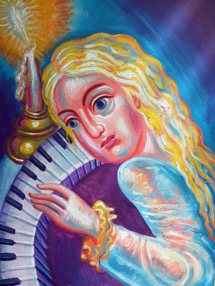 "A Lady Pianist", acrylic on canvas, Athens, 2016. Fr Stamatis explains the creative desire in young lady pianist. The girl is depicted bending forward, in the moment of creativity, composing a new melody, while her eye "reads" the music, with undivided attention to the sound of piano, and the piano becomes elastic and cyclical… It is an ecstatic expression.