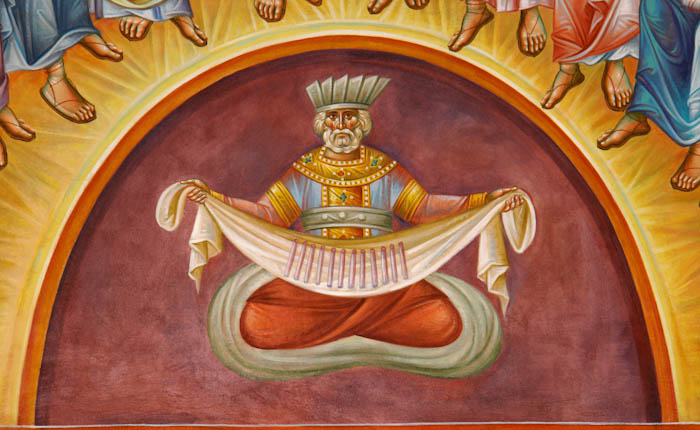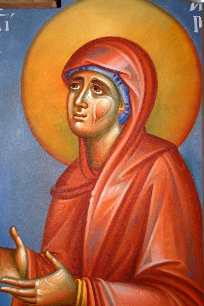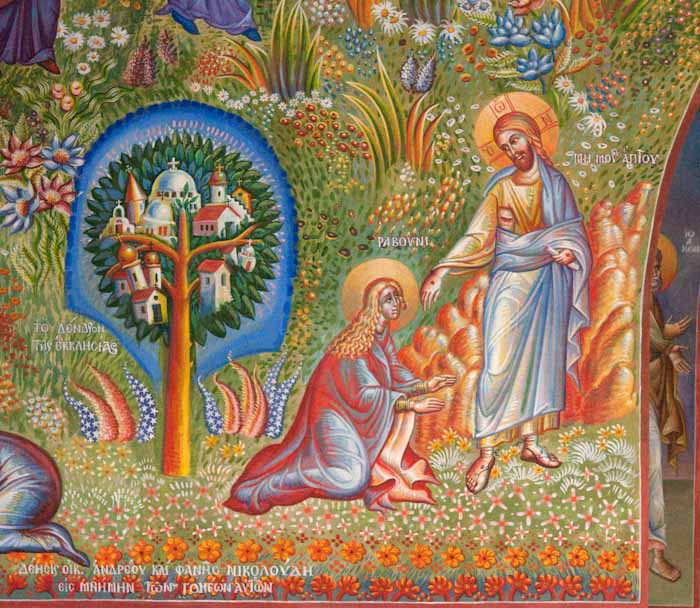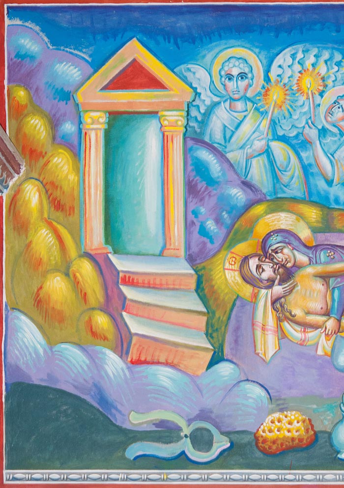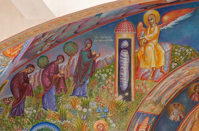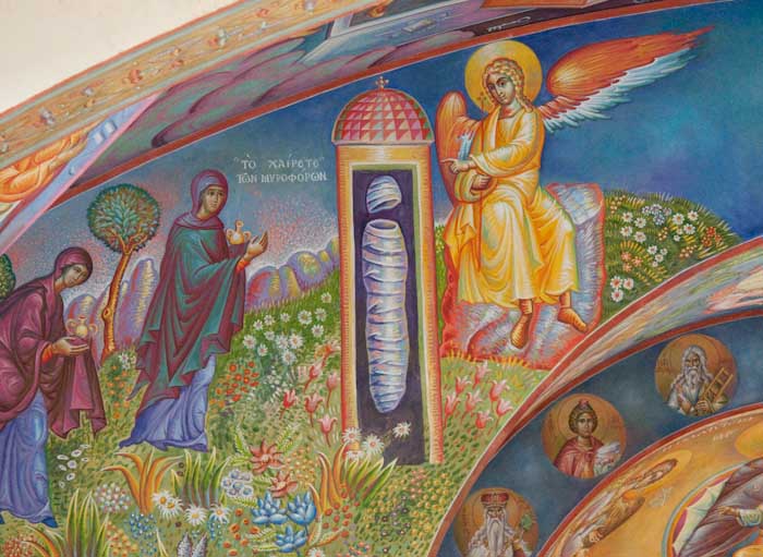 Lamentation upon the Grave (Ἐπιτάφιος θρήνος), detail, Wall Painting, St Nektarios Church, Voula 2016