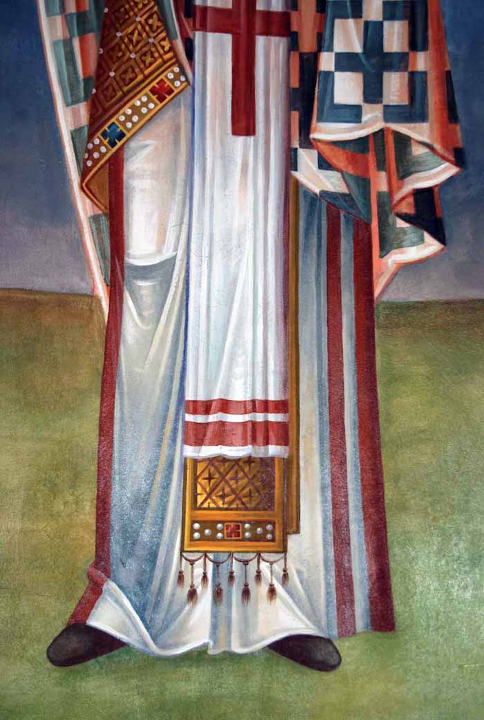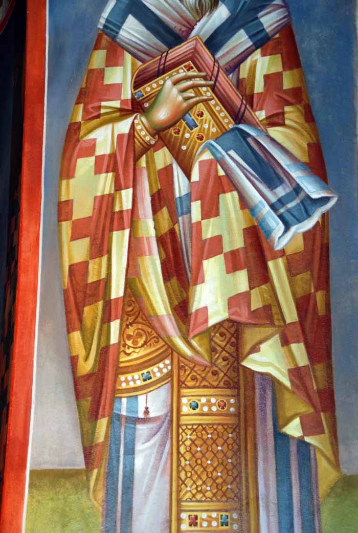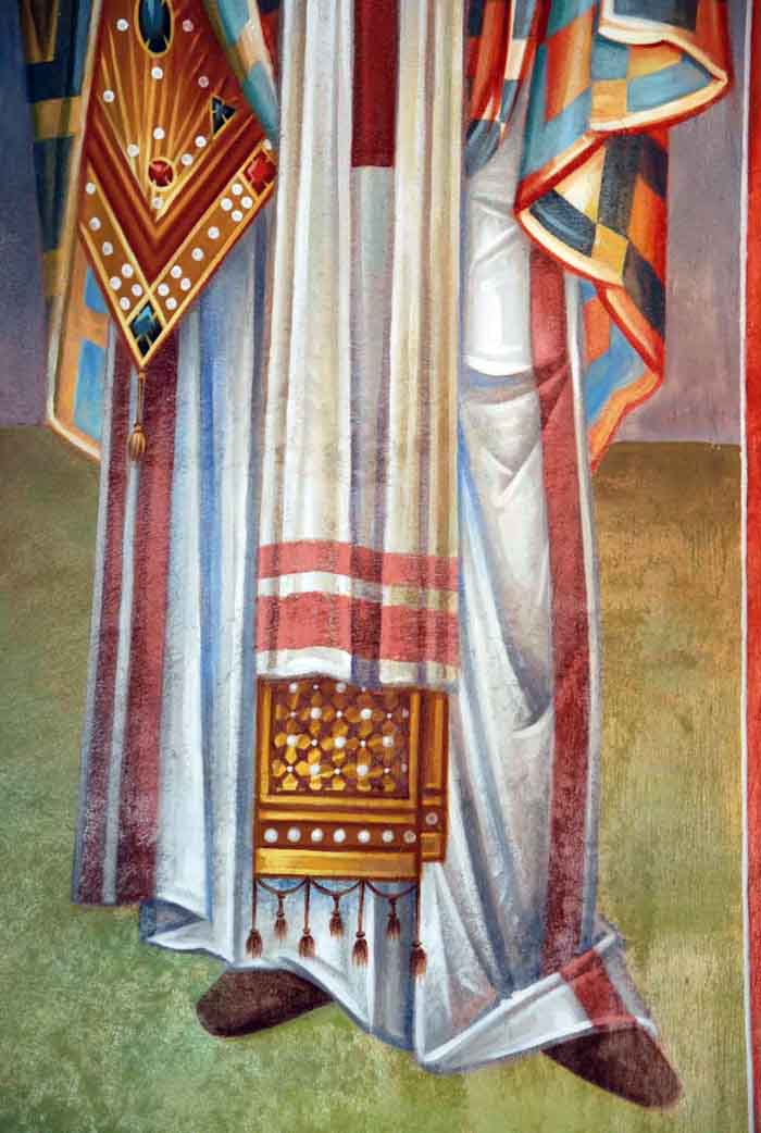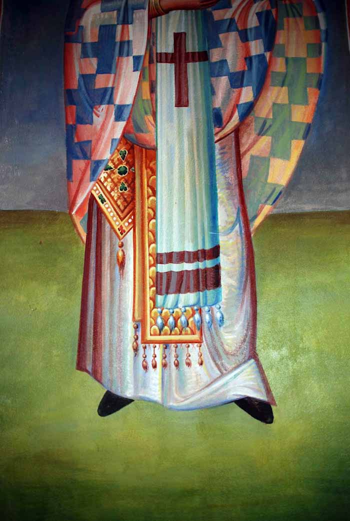 Fr Stamatis begins to paint St John the Theologian in St Nektarios, Ano Voula. Here are seen the first steps, a piece of Saint's garment.