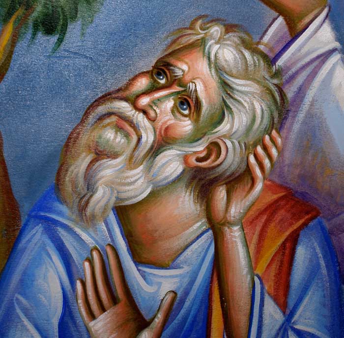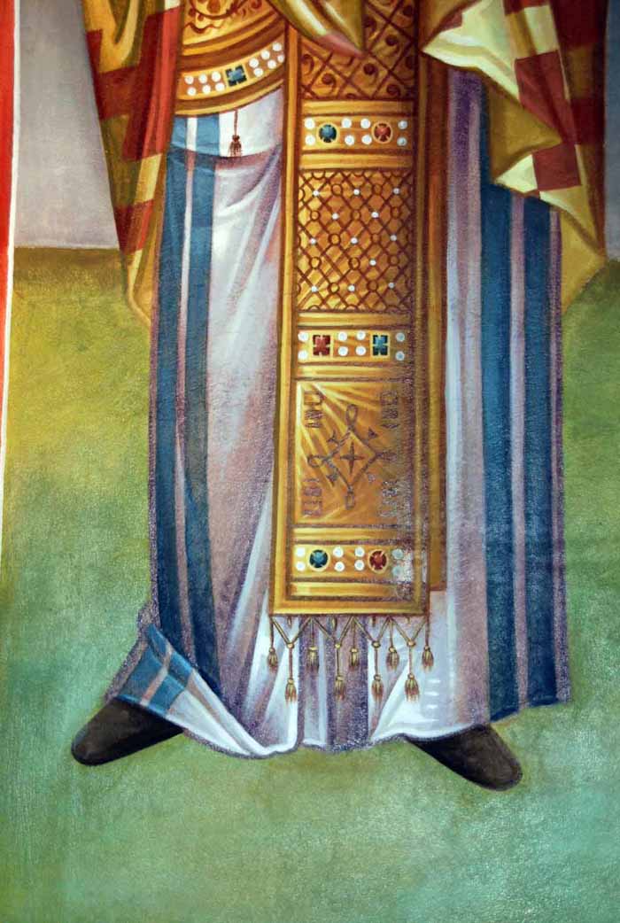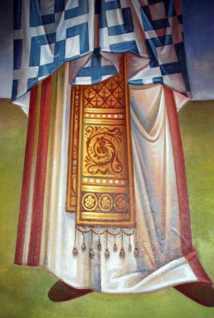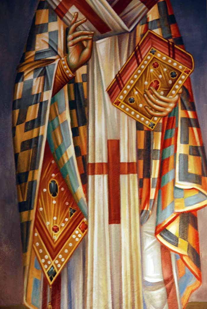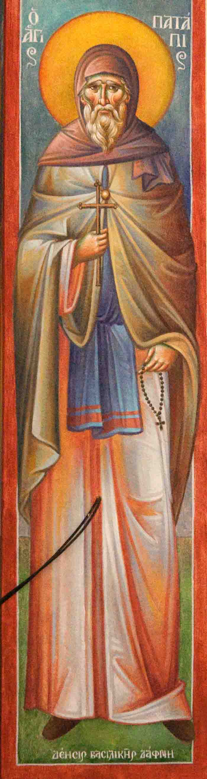 Fr Stamatis begins to paint St John the Theologian in St Nektarios, Ano Voula. Here are seen the first steps, a piece of Saint's garment.