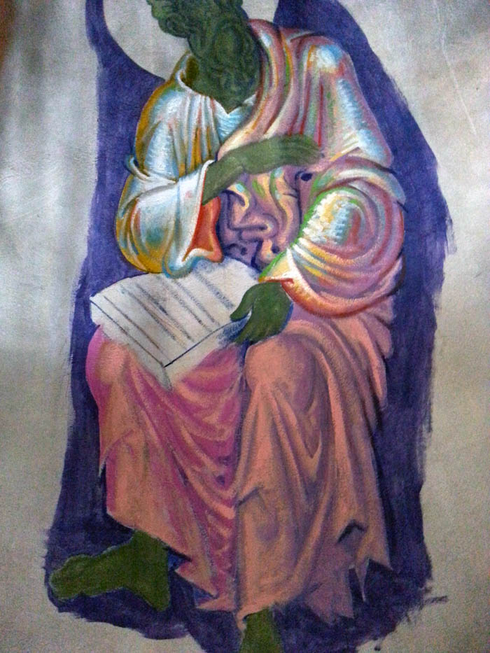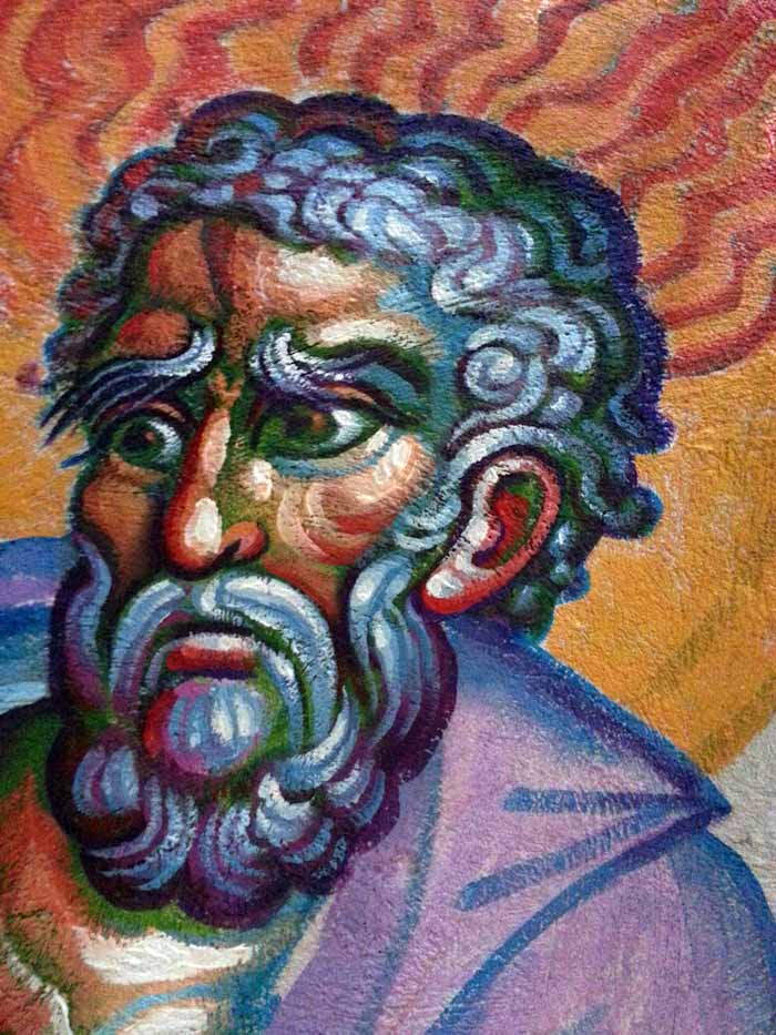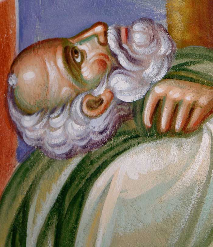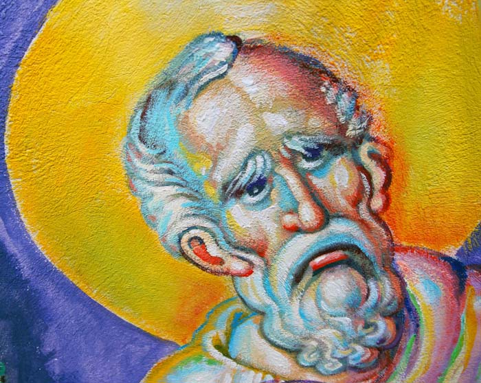 Unfinished face of St John the Theologian, who receives the divine inspiration to write the Gospel. The detail of wall-painting by Stamatis Skliris in St Nektarios Church, Ano Voula, Attiki. Friday, June 6, 2014