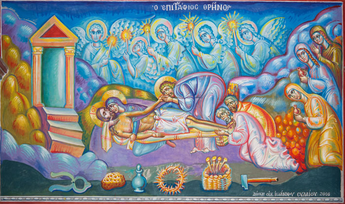 Lamentation upon the Grave (Ἐπιτάφιος θρήνος), Wall Painting, St Nektarios Church, Voula 2016