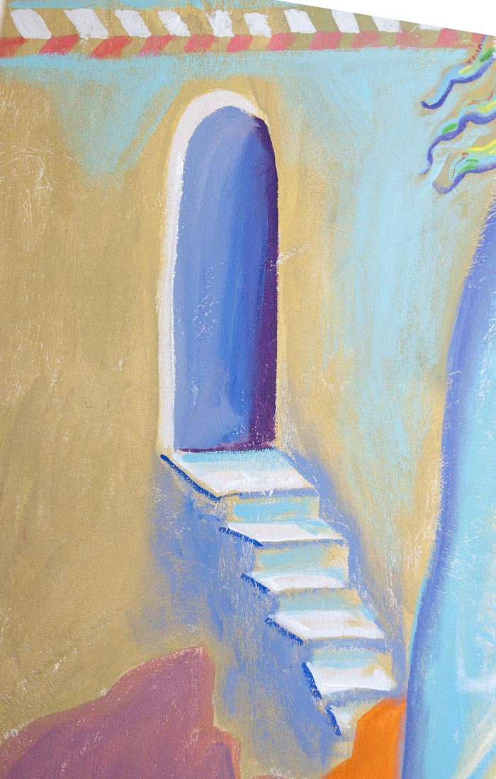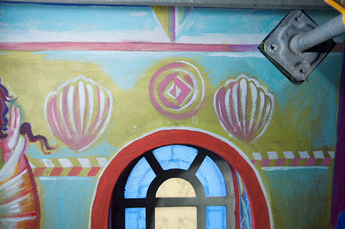 Here is presented the second phase after the drawing. The desing is copied on the wall with blue color and the iconography is ready to start. Wednesday, May 21, 2014.